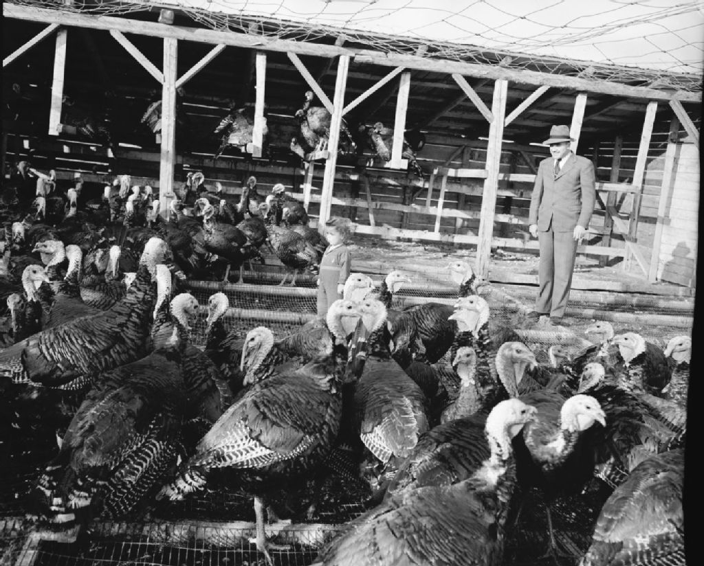 Diverses scènes agricoles sur la ferme de l'Honorable Patrice Tardif, éleveur de dindes à Saint-Méthode, comté de Frontenac, 1948, Archives nationales à Québec, Fonds Ministère de la Culture et des Communications, (03Q,E6,S7,SS1,D2,P67279), Omer Beaudoin.