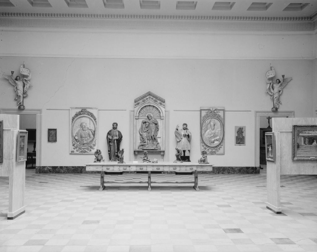 Musée du Québec: deux anges sculptés avec une bannière "Ave Maria", Saint Paul, Saint Joseph de Calansaz, Saint Ambroise et Baptême du Christ