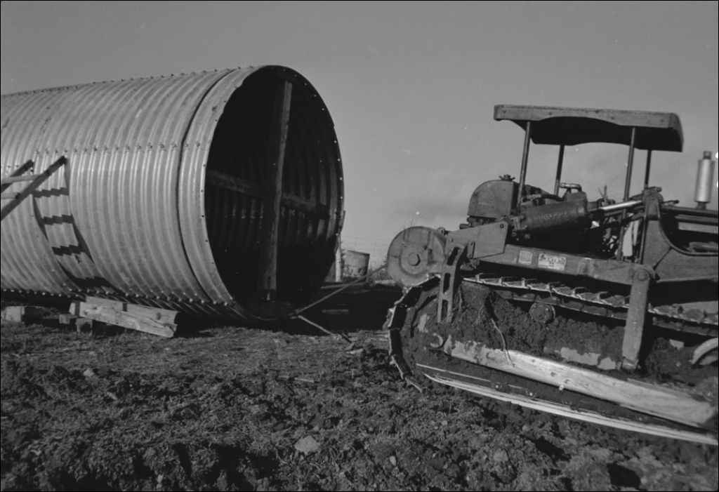 Tracteur en position pour trainer le tuyau Armco multiplatte à Saint-François-Xavier-des-Hauteurs, comté de Rimouski
