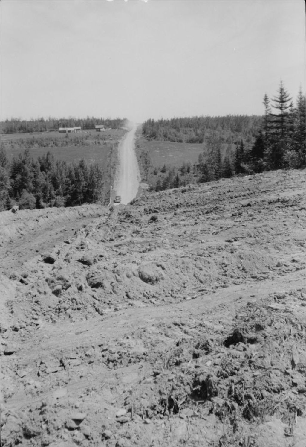 Vue panoramique de la coulée Claveau et du chemin à Saint-François-Xaviers-des-Hauteurs, comté de Rimouski
