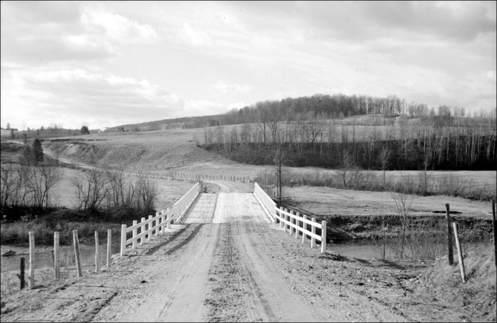 Vue des garde-corps du pont du rang X à Saint-Christophe, comté d'Arthabaska, 1948, Archives nationales à Québec, Fonds Ministère de la Culture et des Communications, (03Q,E6,S7,SS1,D2,P67796), Louis-Philippe Poudrier.