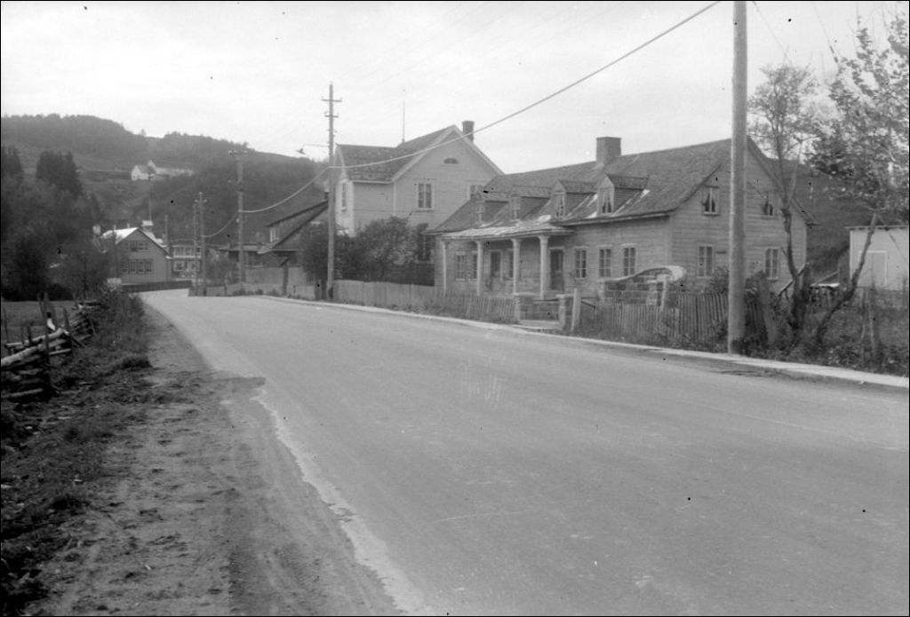 Garage de la voirie en construction, maison de Laure Conan et monument élevé à sa mémoire. La Malbaie, comté de Charlevoix, 1948, Archives nationales à Québec, Fonds Ministère de la Culture et des Communications, (03Q,E6,S7,SS1,D2,P67800), Roméo Savary.