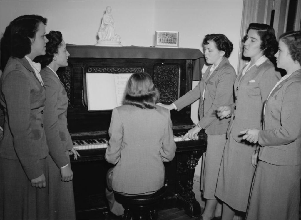Élèves jouant au piano au convent Sainte-Ursule à Louiseveille, 1948, Archives nationales à Québec, Fonds Ministère de la Culture et des Communications, (03Q,E6,S7,SS1,D2,P67842), Fernand Rivard.