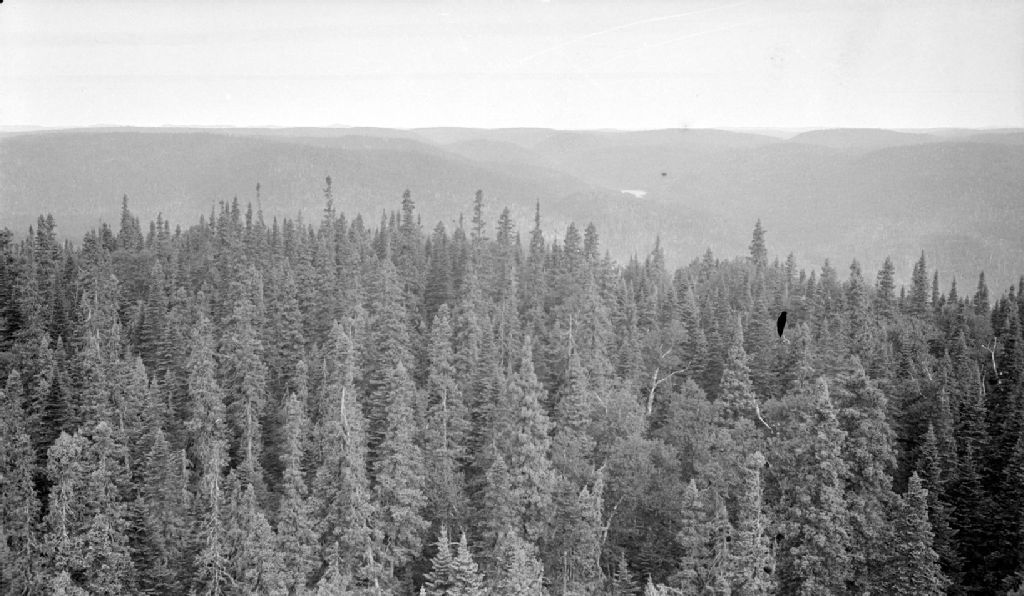 Bassin de la rivière Roussel, photographié de la tour des gardes-feu à Sault-au-Mouton, 1932, Archives nationales à Québec, Fonds Ministère de la Culture et des Communications, (03Q,E6,S7,SS1,D2,P67882), Robert Bellefeuille.