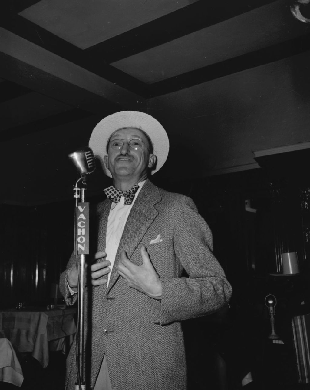 Dr.J.E. Laforest adressant la parole lors de la soirée récréative de l'exposition de visons, à Québec, 1948, Archives nationales à Québec, Fonds Ministère de la Culture et des Communications, (03Q,E6,S7,SS1,D2,P68010), Omer Beaudoin.