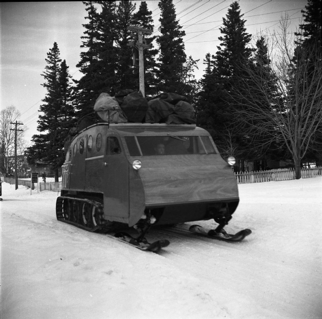 Trafic des autoneiges à Tadoussac, 1948, Archives nationales à Québec, Fonds Ministère de la Culture et des Communications, (03Q,E6,S7,SS1,D2,P68262), Gustave Bédard.