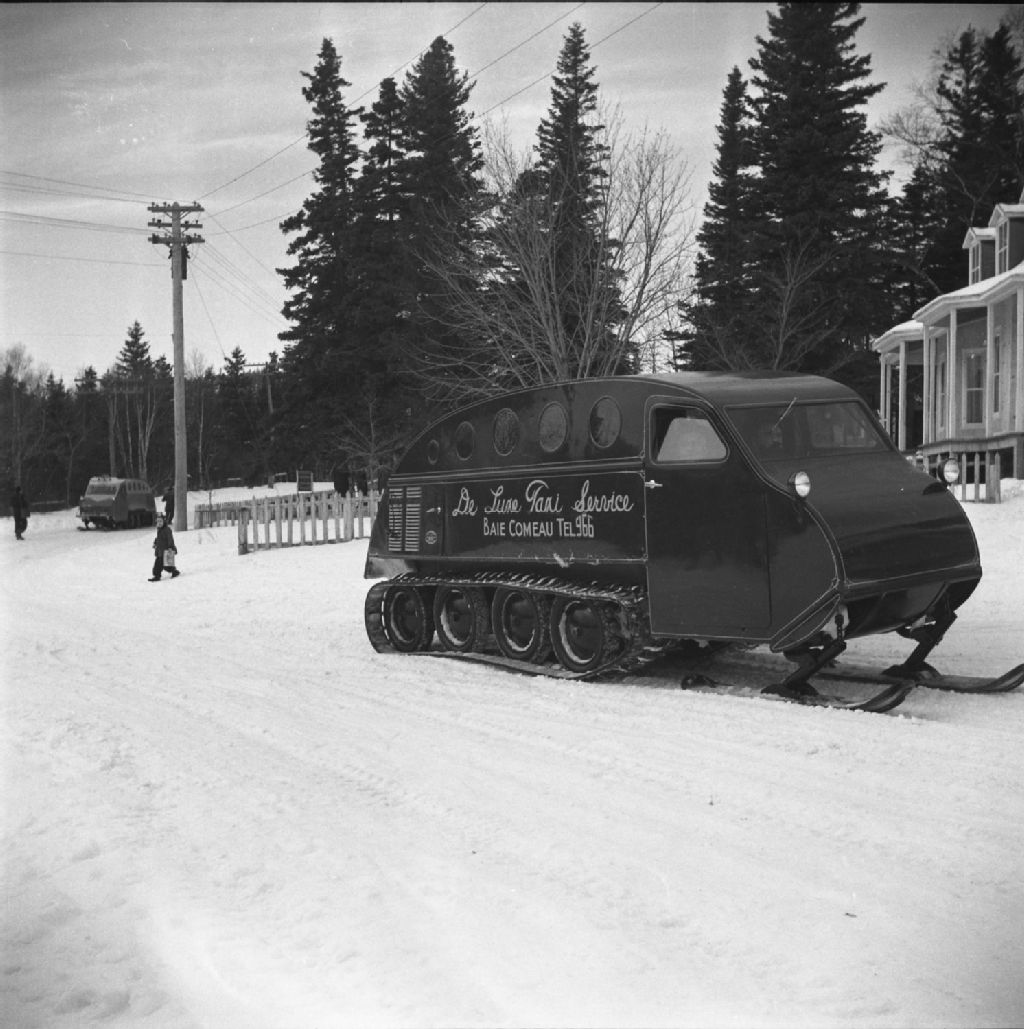 Trafic des autoneiges à Tadoussac, 1948, Archives nationales à Québec, Fonds Ministère de la Culture et des Communications, (03Q,E6,S7,SS1,D2,P68263), Gustave Bédard.