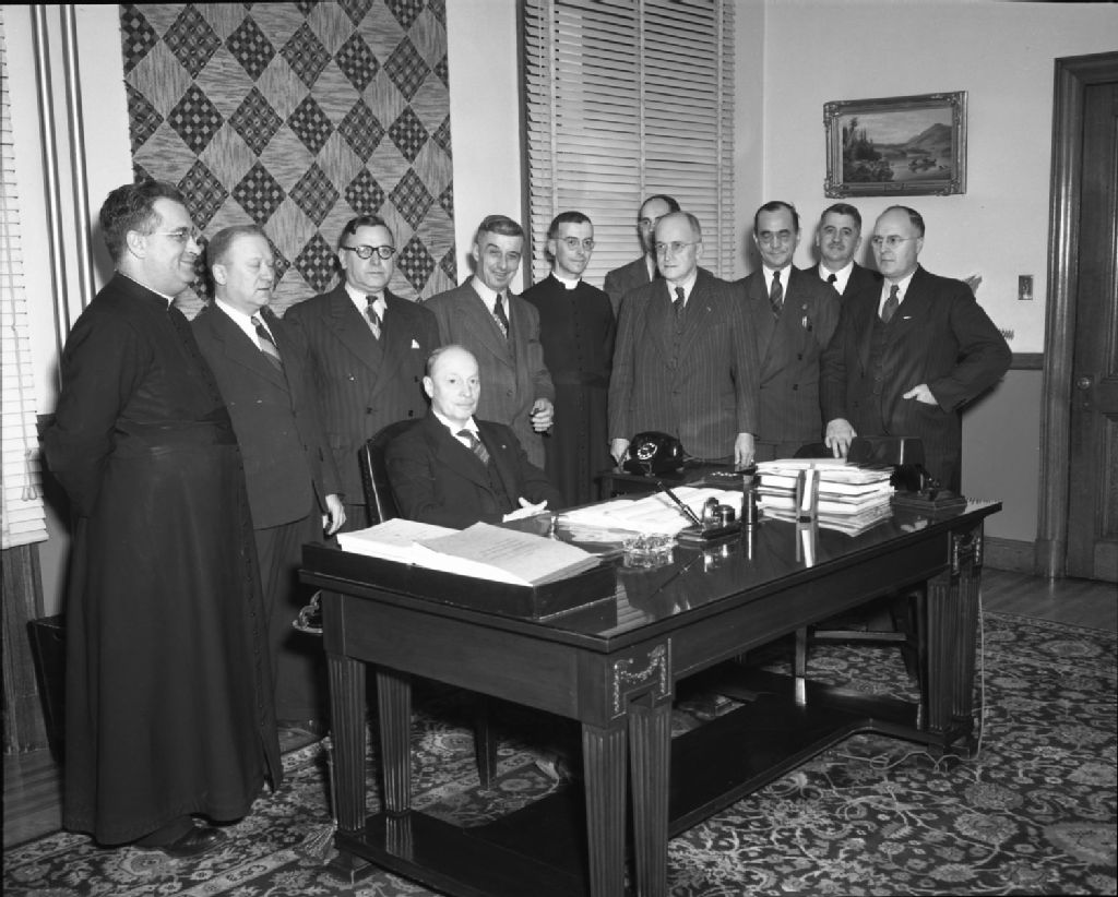 Groupe à l'occasion d'un octroi du Ministère de la Santé, Vers 1949, Archives nationales à Québec, Fonds Ministère de la Culture et des Communications, (03Q,E6,S7,SS1,D2,P68521), Neuville Bazin.