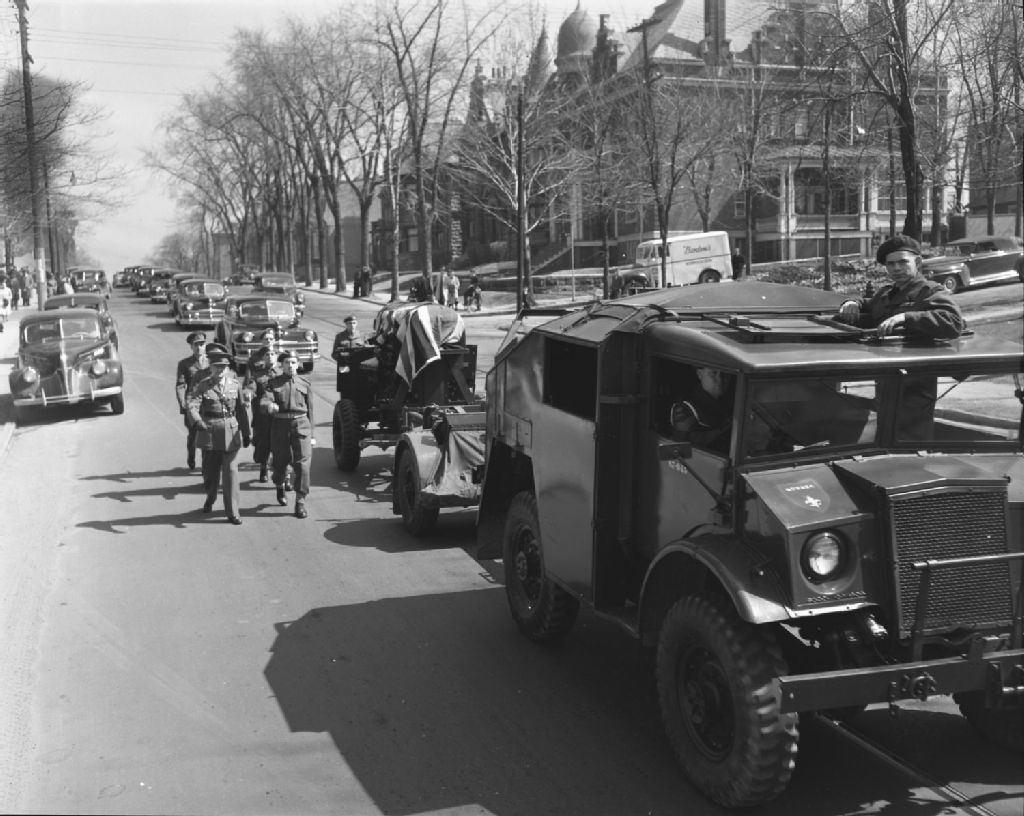 Funérailles du Colonel Chabot, Saint-Coeur-de-Marie, Québec, 1949, Archives nationales à Québec, Fonds Ministère de la Culture et des Communications, (03Q,E6,S7,SS1,D2,P68728), Neuville Bazin.