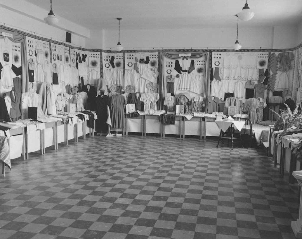 Divers travaux de couture exposés dans une grande salle. Loretteville