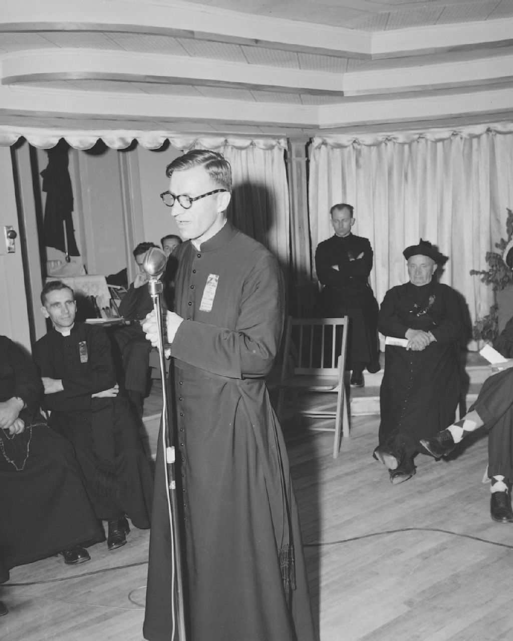 Monsieur le curé de Grandes-Bergeronnes adressant la parole à la foule, après la cérémonie de bénédiction du couvent de l'endroit, Grandes-Bergeronnes, comté de Saguenay