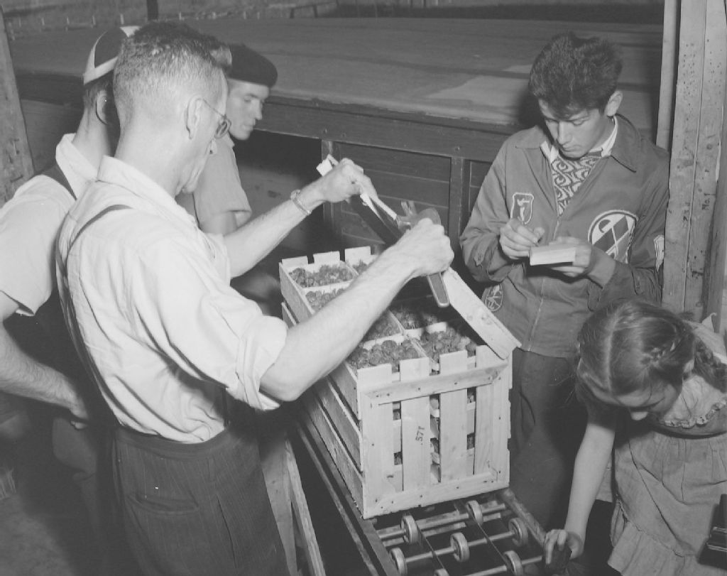 Inspection des fraises. La Durantaye, comté de Bellechasse, 1949, Archives nationales à Québec, Fonds Ministère de la Culture et des Communications, (03Q,E6,S7,SS1,D2,P69969), Neuville Bazin.