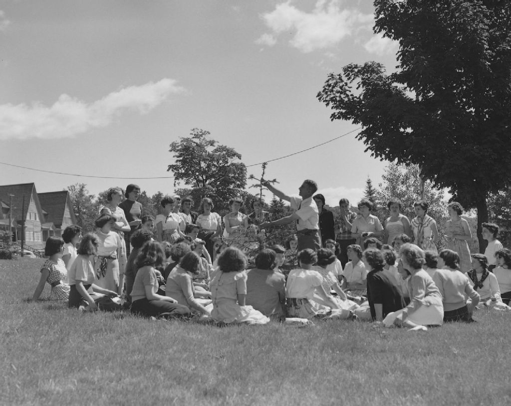 Leçon de sylviculture par Monsieur Fafard à Duchesnay., 1949, Archives nationales à Québec, Fonds Ministère de la Culture et des Communications, (03Q,E6,S7,SS1,D2,P70197), Omer Beaudoin.