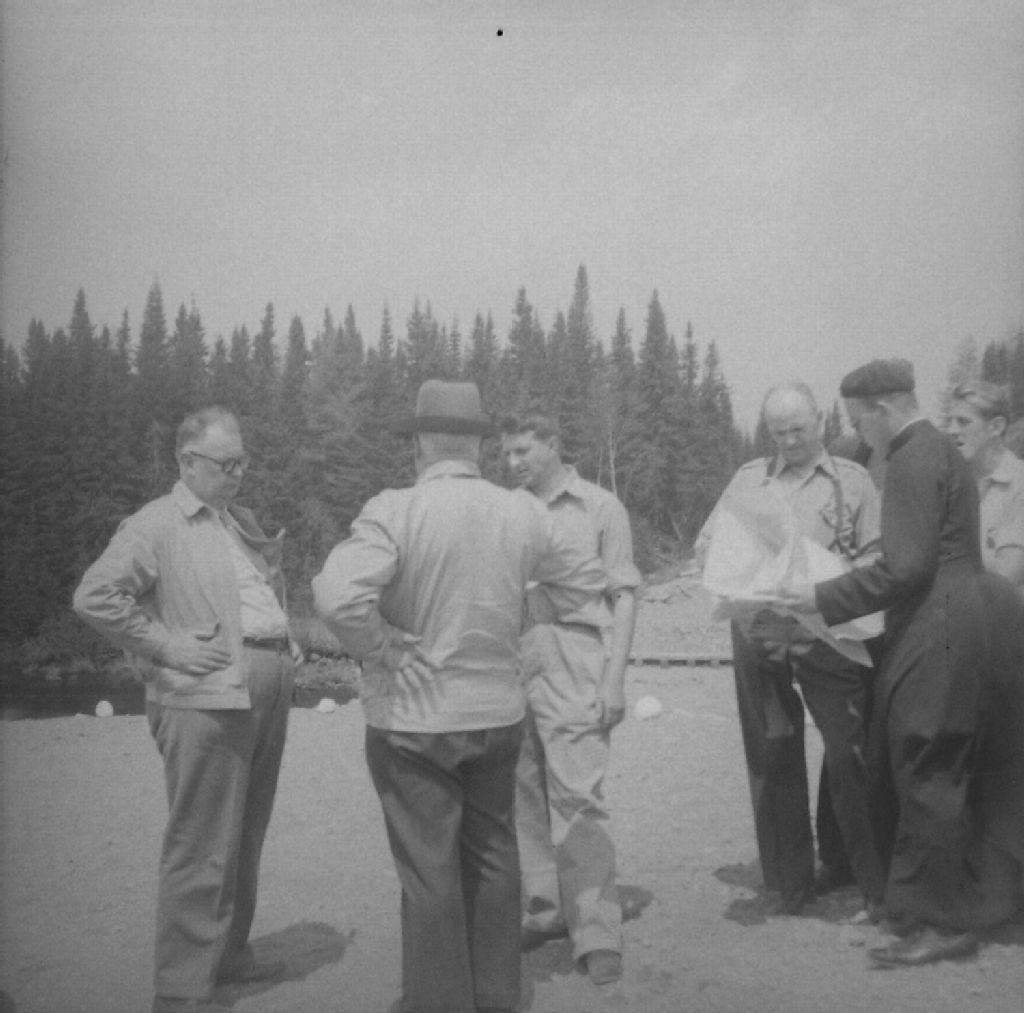 Le long de la rivière Montmorency dans le parc national des Laurentides, comté de Montmorency. De gauche à droite; le révérend père Bergounioux, professeur de géologie à l'Université de Toulouse, l'abbé Laverdière, professeur de géologie à l'Université Laval, le Père Sanschagrin, O.M.I., le professeur Carl Faesler, géologue, l'abbé Rosaire Bélanger, E.S.A à Sainte-Anne et Camille Laverdière, E.S.A. à Sainte-Anne