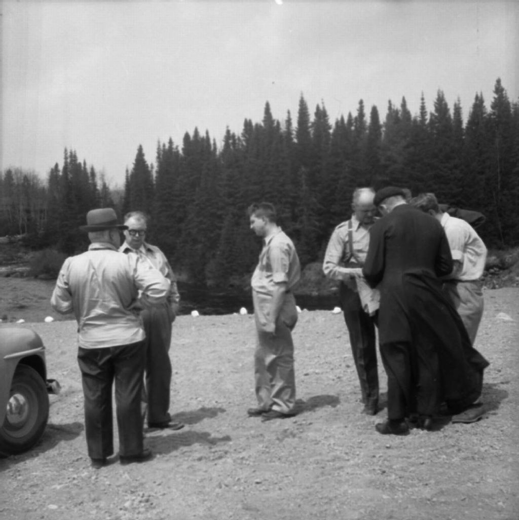 Le long de la rivière Montmorency dans le parc national des Laurentides, comté de Montmorency. Le professeur Carl Faesler donnant des explications sur la géologie aux excursionnistes, 1950, Archives nationales à Québec, Fonds Ministère de la Culture et des Communications, (03Q,E6,S7,SS1,D2,P70462), Auguste Scott.
