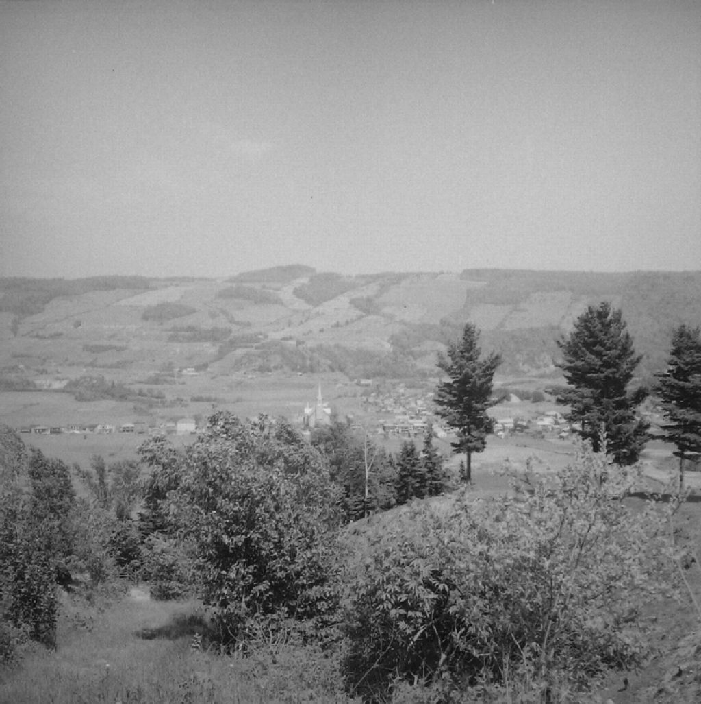 Les côtés de Saint-Urbain. Pentes recouvertes de Till glaciaire. Sol limono-caillouteux fréquemment décapé par l'érosion. Les surfaces dénudées sont de teinte claire. Le fond de la vallée où coule la rivière du Gouffre est tapissée d'alluvions fluviatiles et Champlain. On aperçoit l'église et le village de Saint-Urbain, comté de Charlevoix