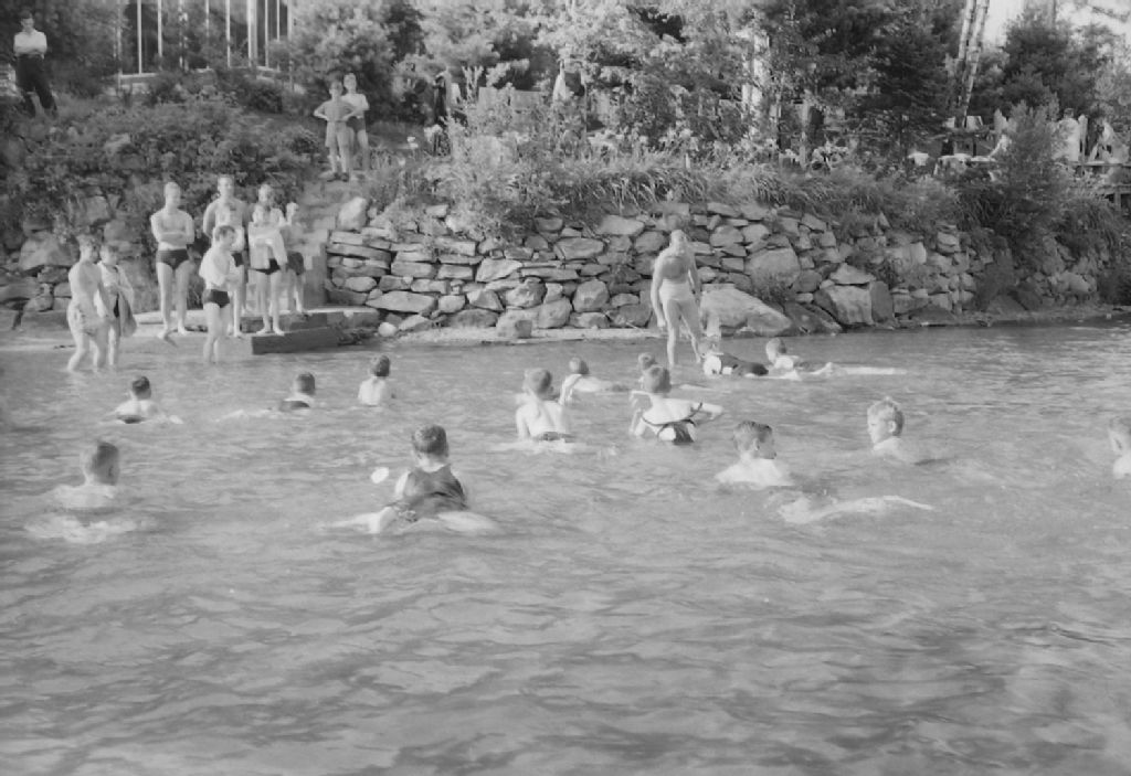 Cours de sécurité aquatique donné par monsieur Paul Mecteau, de la Croix-Rouge, Lac Simon, 3 août 1949, Archives nationales à Québec, Fonds Ministère de la Culture et des Communications, (03Q,E6,S7,SS1,D2,P70565), Robert Angers.