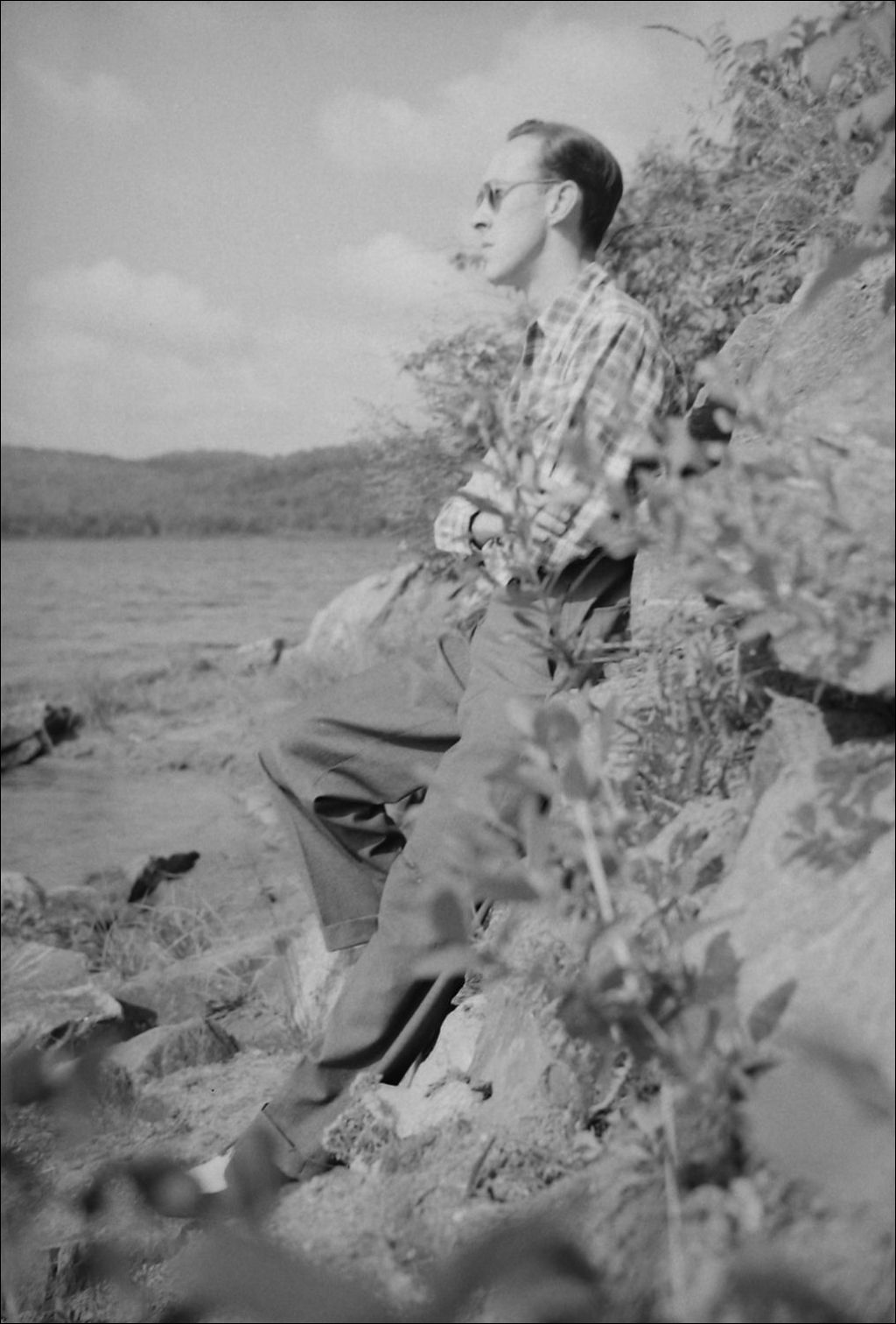 Un homme se repose sur la grève. Cours de sécurité aquatique donné par monsieur Paul Mecteau, de la Croix-Rouge, Lac Simon