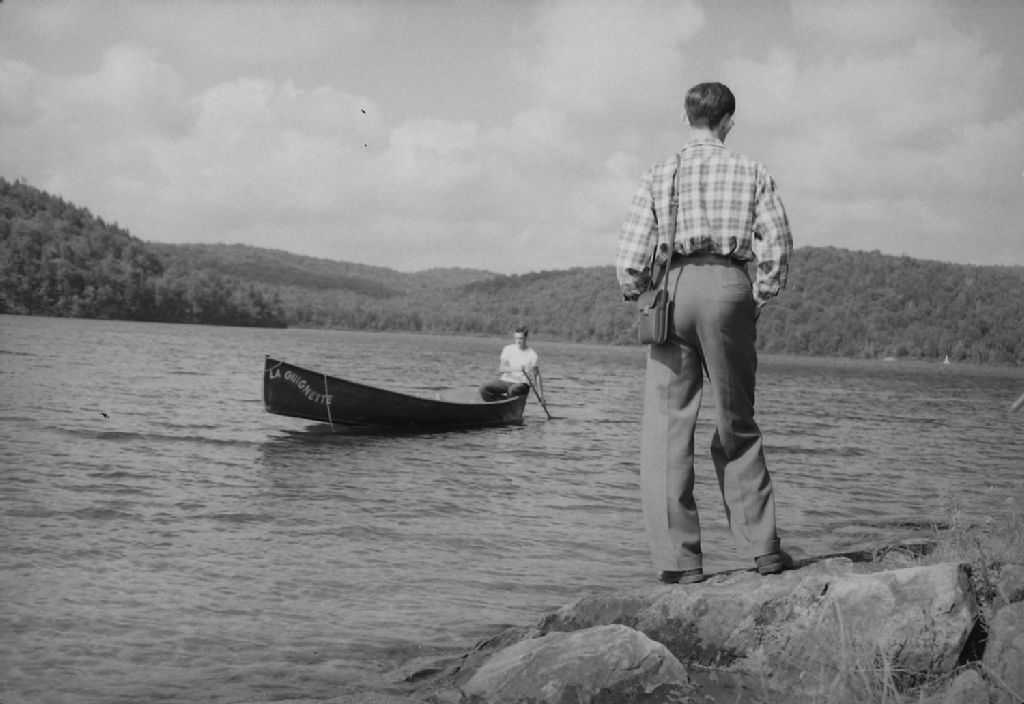 Un homme observe un canot de la grève. Cours de sécurité aquatique donné par monsieur Paul Mecteau, de la Croix-Rouge, Lac Simon