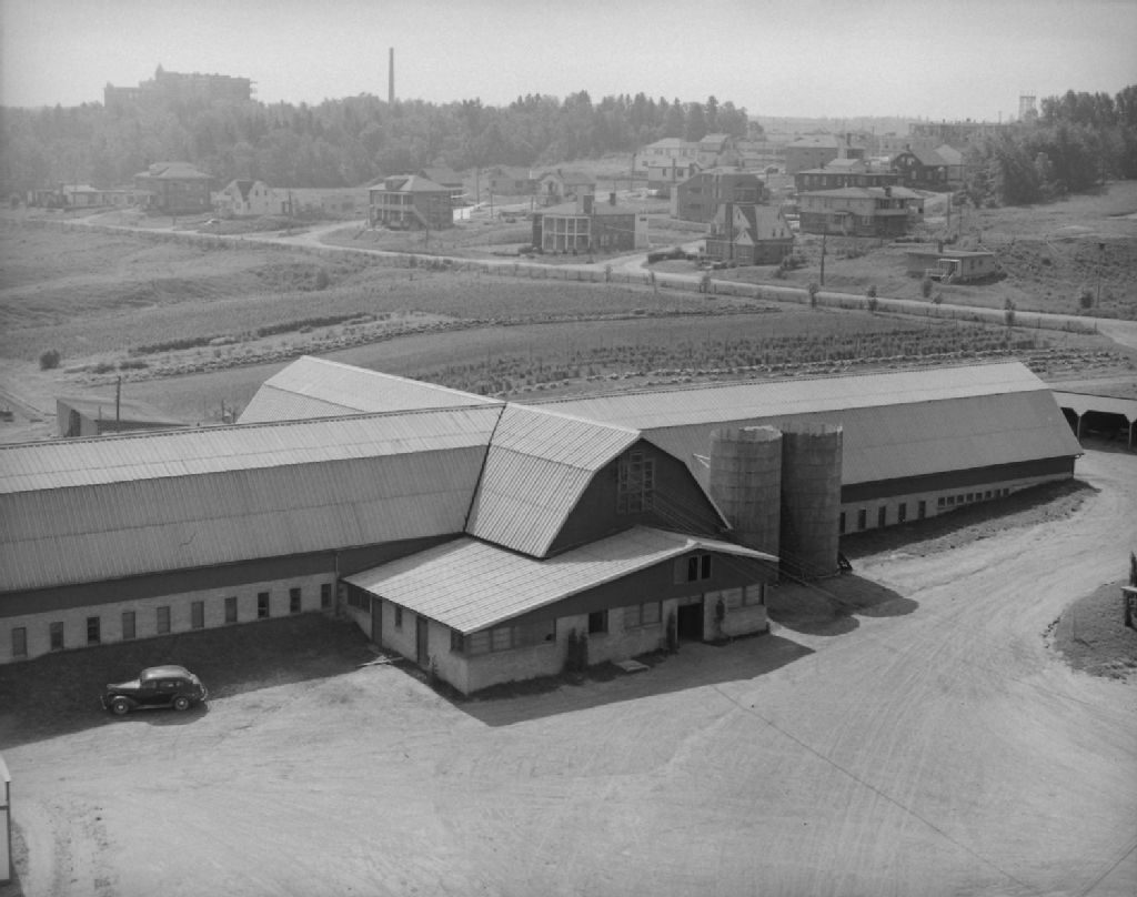 Groupe et annexe sur la ferme de l'Hôpital Saint-Vallier à Chicoutimi., 1949, Archives nationales à Québec, Fonds Ministère de la Culture et des Communications, (03Q,E6,S7,SS1,D2,P70607), Omer Beaudoin.