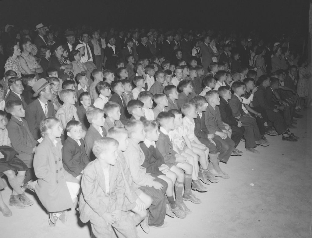 Une partie de la foule et un groupe d'orphelins qui assistent à la représentation cinématographique de la Croix-Rouge sur la prévention des accidents de l'onde. Lac Etchemin