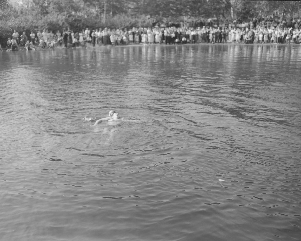 Nage au lac Etchemin, 1949, Archives nationales à Québec, Fonds Ministère de la Culture et des Communications, (03Q,E6,S7,SS1,D2,P71136), Neuville Bazin.