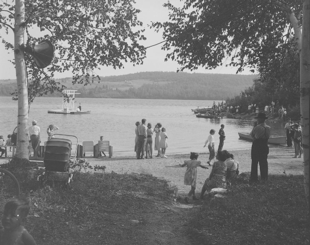 Plage où s'est déroulée la grande démonstration de natation et de sauvetage de la Croix-Rouge. Lac Etchemin