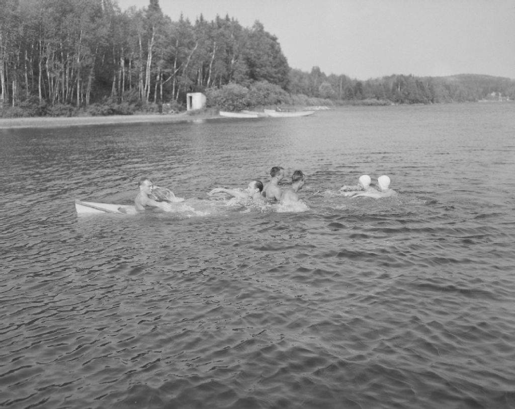 Les instructeurs de la Croix-Rouge démontrent qu'une embarcation remplie d'eau peut servir de radeau. Démonstration pratique de la Croix-Rouge sur la sécurité aquatique. Lac Etchemin