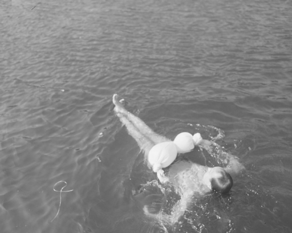 Jean-Paul Robitaille, surveillant de district pour la Croix-Rouge démontre que l'on peut se servir d'une paire de pantalon comme bouée. Lac Etchemin