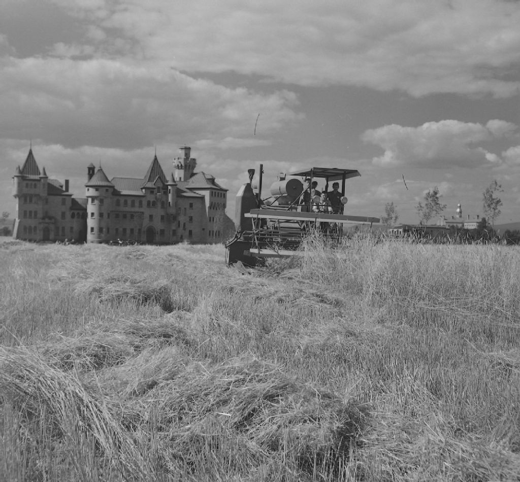 Moissonneuse-lieuse à l'ouvrage à la prison des femmes. Québec