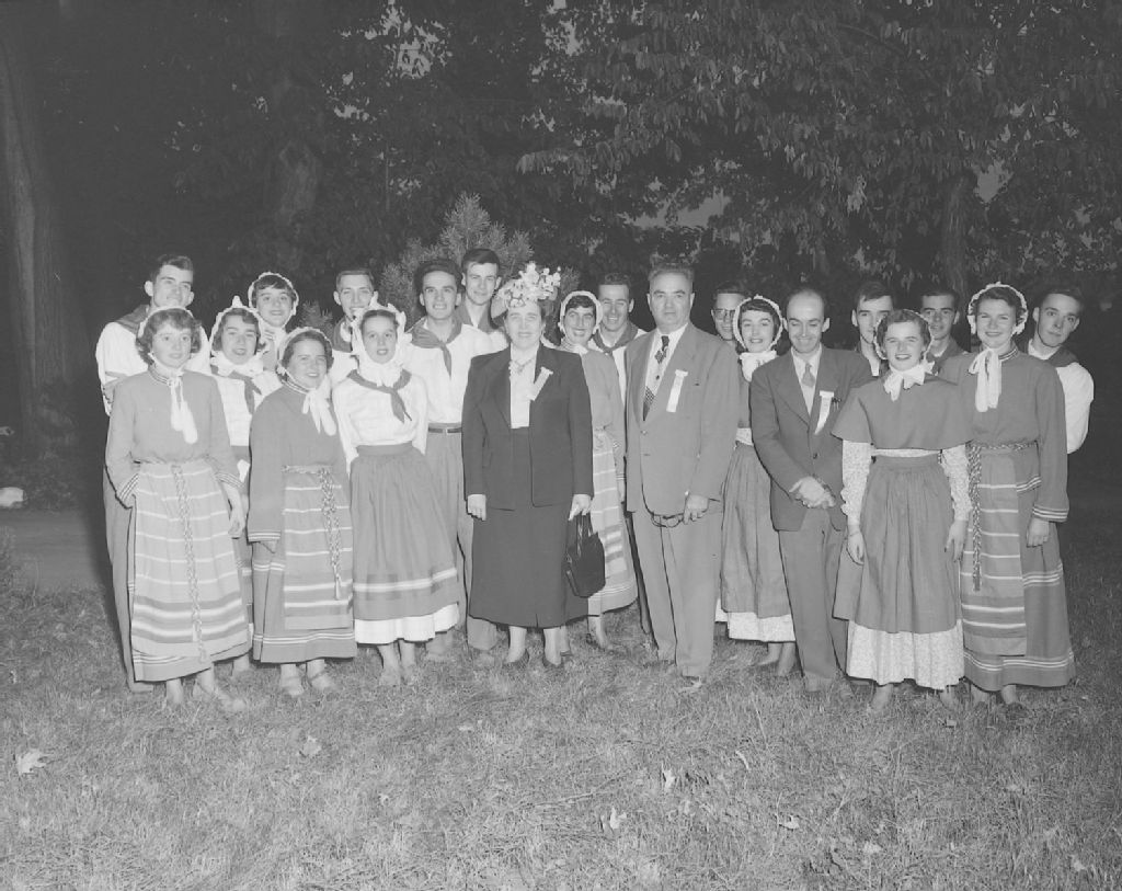 Groupe formé de membres de l'Ordre du bon temps en compagnie de madame Farmer de Montréal. Collège Jésus-Marie, Sillery, 1949, Archives nationales à Québec, Fonds Ministère de la Culture et des Communications, (03Q,E6,S7,SS1,D2,P71580), Neuville Bazin.