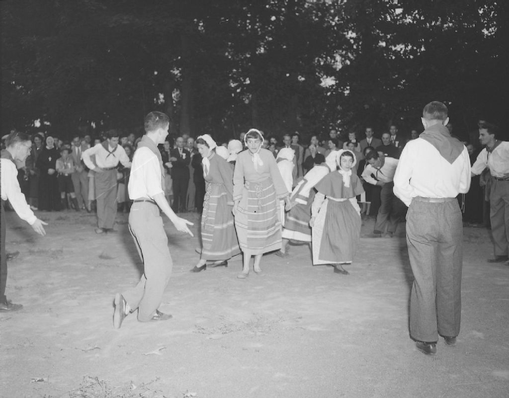 Membres de l'Ordre du bon temps exécutant une danse à l'occasion d'un thé en plein air offert aux membres de l'Association canadienne des éducateurs de langue française. Collège Jésus-Marie, Sillery