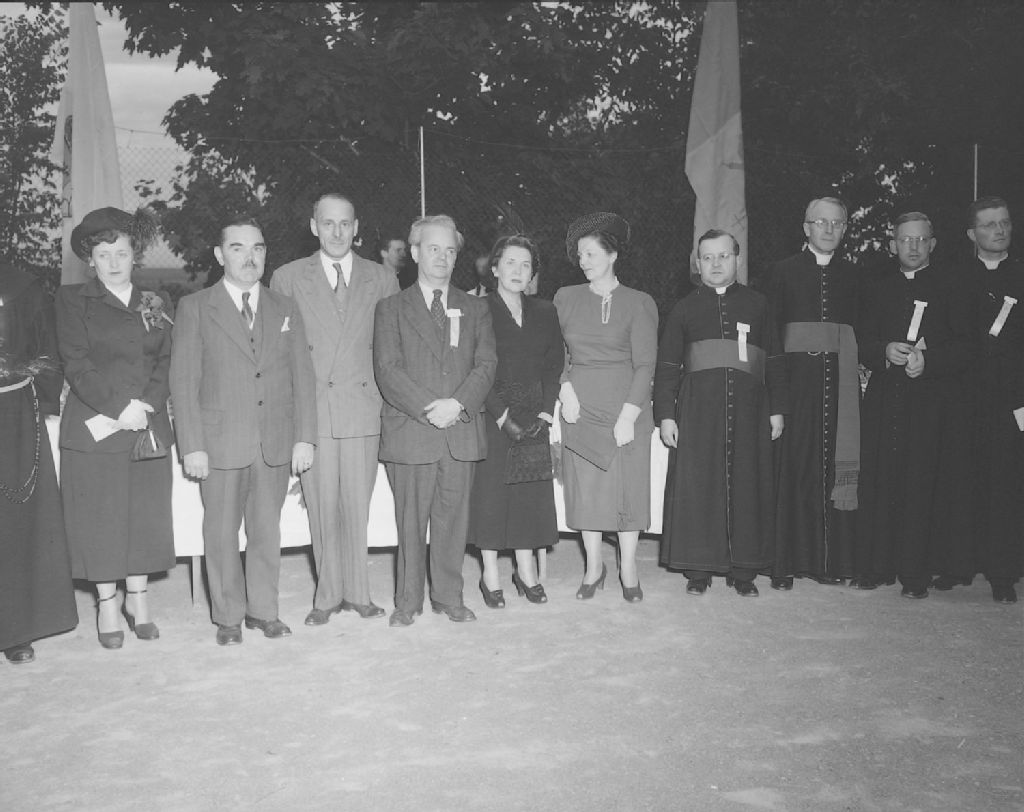 Quelques invités (de madame Savard au Chanoine Richard) au thé champêtre offert aux membres de l'Association canadienne des éducateurs de langue française. Collège Jésus-Marie, Sillery
