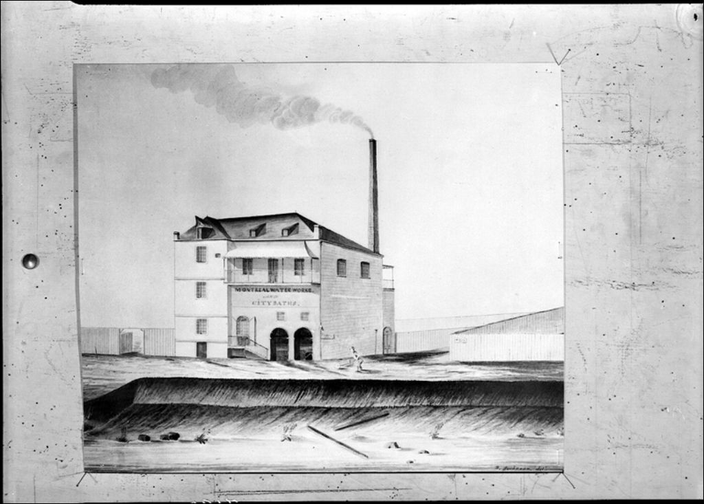 Peinture: Usine et aqueduc de la cité de Montréal en 1845, 1942, Archives nationales à Québec, Fonds Ministère de la Culture et des Communications, (03Q,E6,S7,SS1,D2,P7190), Neuville Bazin (copie).