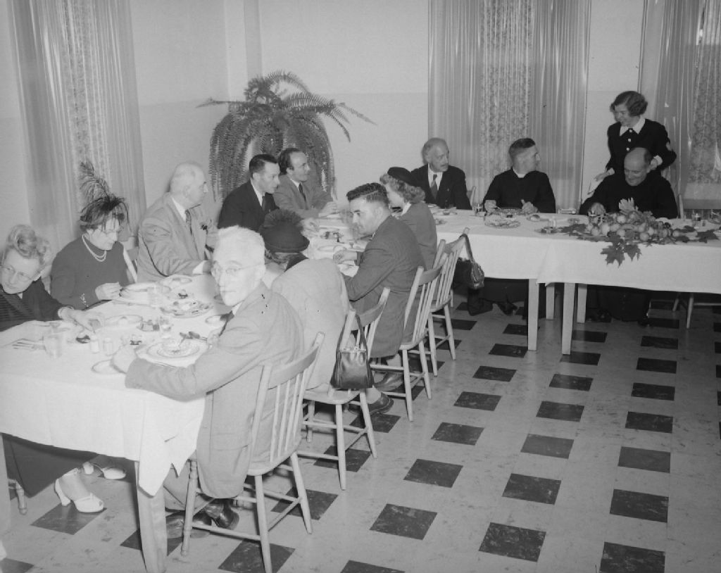 Photo en trois sections des invités au souper offert au pèlerins du Comité Marquette (France).École ménagère de Loretteville