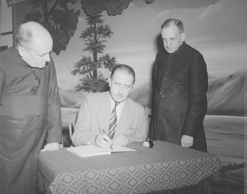 Monsieur le Sénateur Louis Terninck, Président du Comité Marquette de France signe le Livre d'or de l'Institut des Soeurs de Saint-Louis de France à Loretteville. L'Abbé Albert Tessier à sa droite. À sa gauche l'aumonier du couvent de Loretteville. École ménagère de Loretteville, 1949, Archives nationales à Québec, Fonds Ministère de la Culture et des Communications, (03Q,E6,S7,SS1,D2,P72312), Neuville Bazin.
