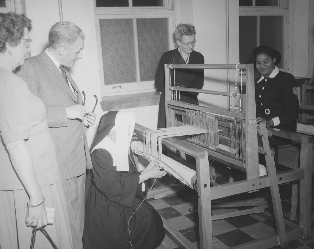 Durant la visite de l'École ménagère de Loretteville, un groupe s'arrête à la salle de tissage. Au métier, une jeune Haïtienne. Madame Barbier suit son travail de près. Monsieur et madame Pradal observent. École ménagère de Loretteville