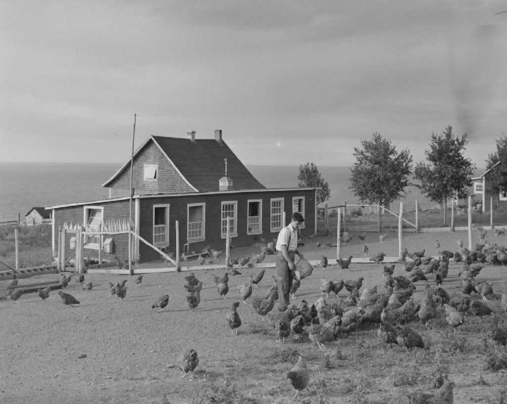 Homme nourrissant la volaille. Chez Omer Pelletier, Baie-des-Sables.