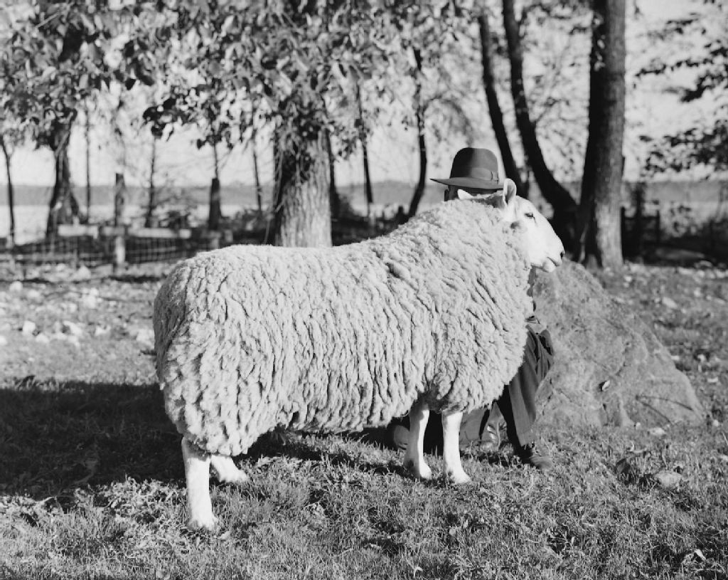 Bélier North County importé du Royaume-Uni, à Deschambault., 1949, Archives nationales à Québec, Fonds Ministère de la Culture et des Communications, (03Q,E6,S7,SS1,D2,P74198), Omer Beaudoin.