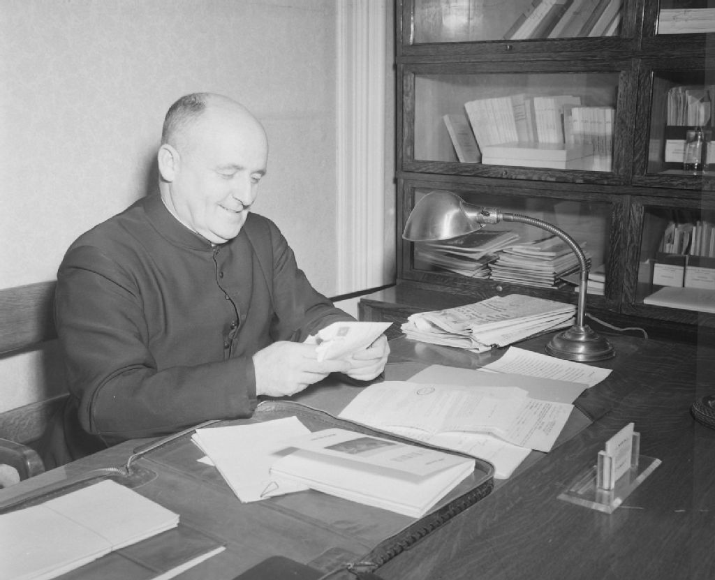 Monseigneur Tessier ouvrant une enveloppe. 110 Saint-Eustache, Québec