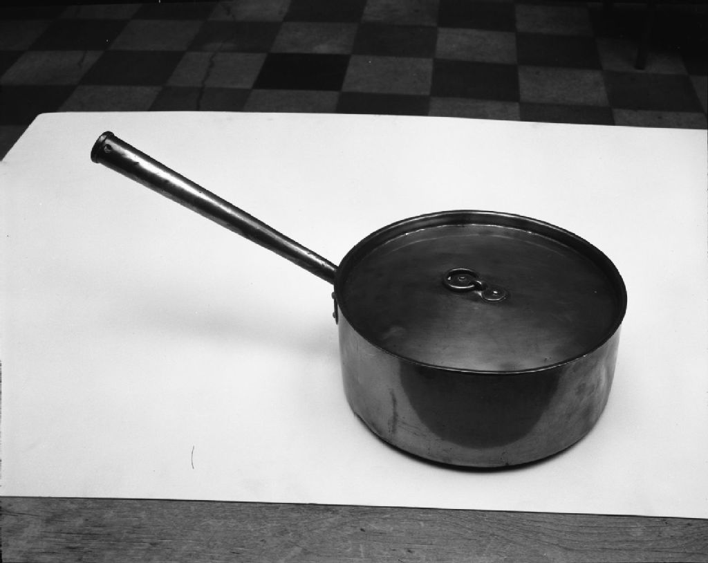 M. U. 2 - Casserole en cuivre avec manche et couvercle. Diamètre 10 pouces, manche de 10.5 pouces. Musée de la Province de Québec, 1950, Archives nationales à Québec, Fonds Ministère de la Culture et des Communications, (03Q,E6,S7,SS1,D2,P75127), Neuville Bazin.