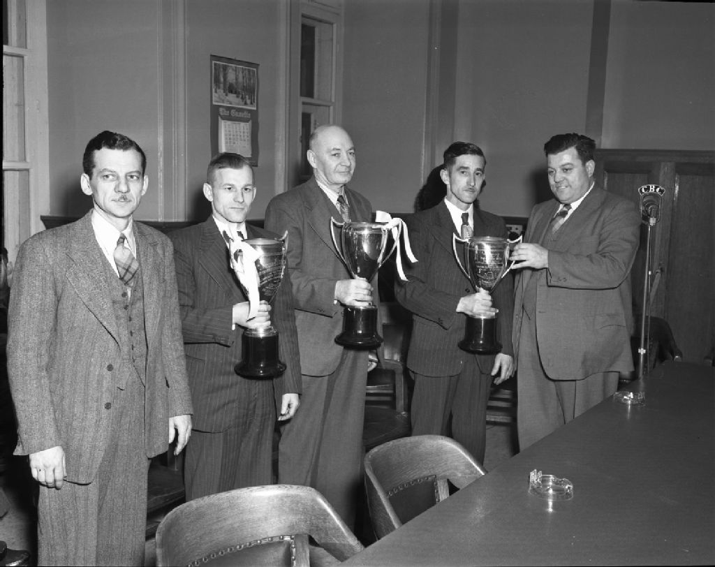 Remise des coupes et trophées aux fabricants de fromage, vainqueurs du concours de fabriques à l'Exposition fromagère de Belleville par l'Honorable Laurent Barré, 1949, 1950, Archives nationales à Québec, Fonds Ministère de la Culture et des Communications, (03Q,E6,S7,SS1,D2,P75164), Neuville Bazin.