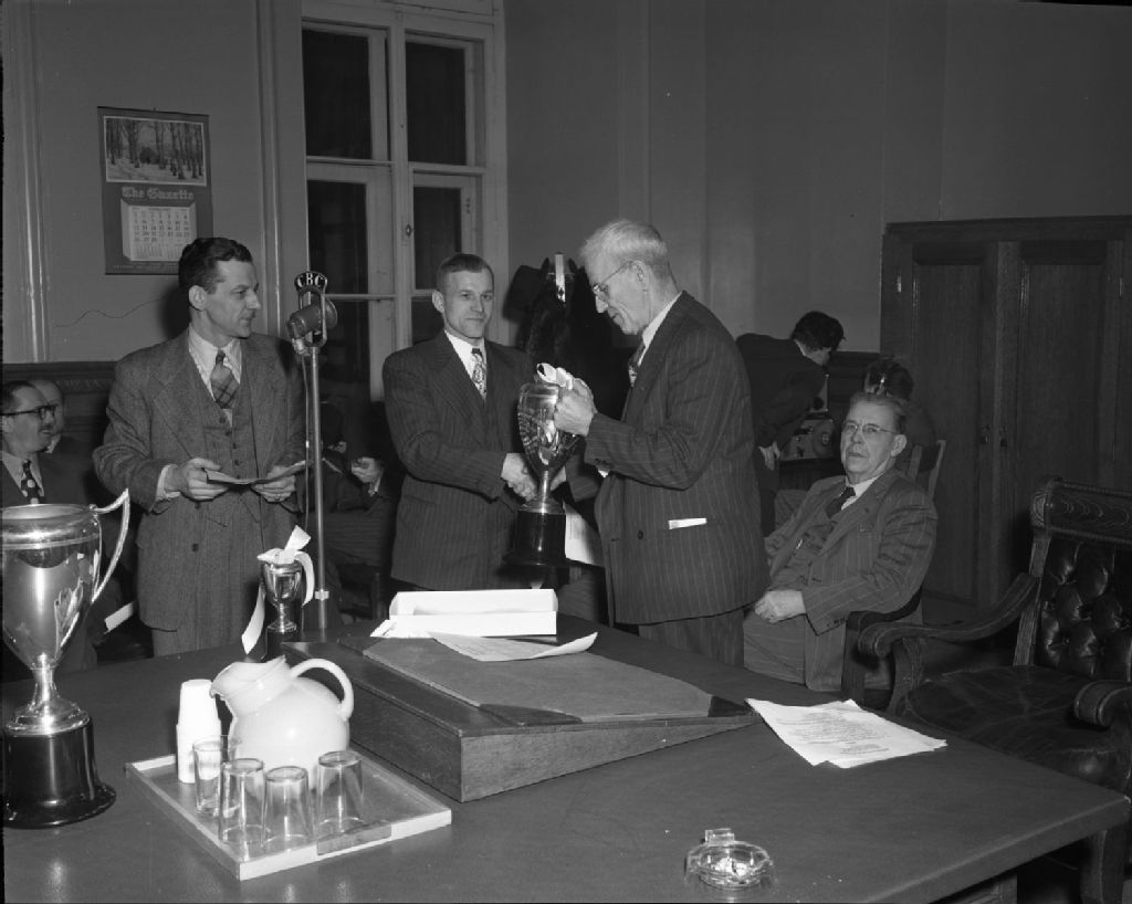 Remise des coupes et trophées aux fabricants de fromage, vainqueurs du concours de fabriques à l'Exposition fromagère de Belleville par l'Honorable Laurent Barré, 1949