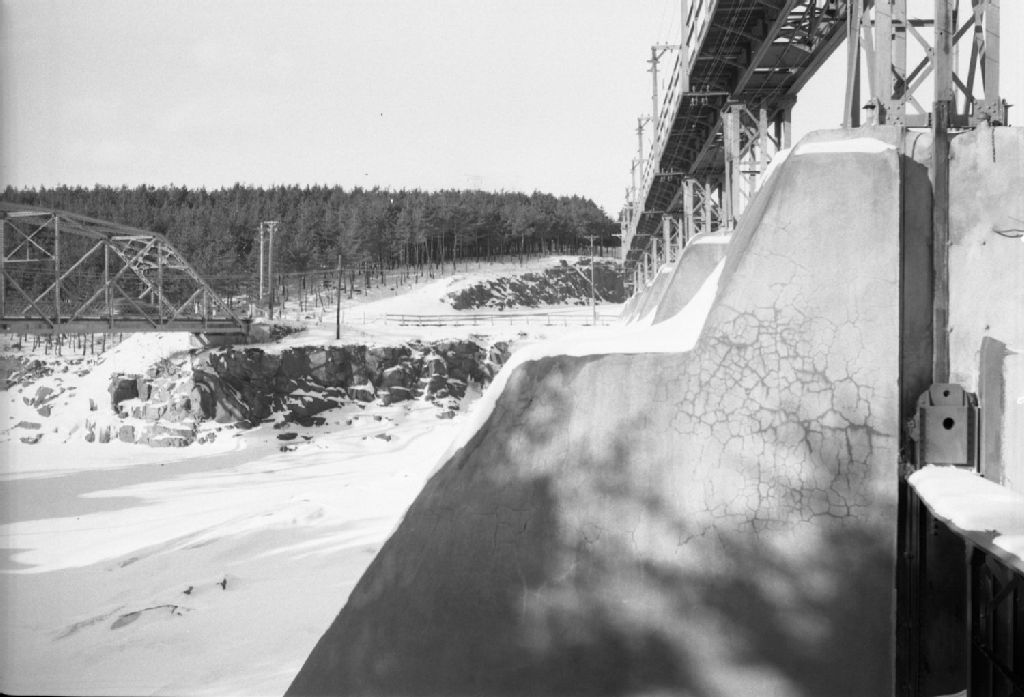 Barrage sur la rivière Saint-Maurice, branche est, entre Almaville et Ile Melville à Shawinigan Falls. Comté de Saint-Maurice, 1950, Archives nationales à Québec, Fonds Ministère de la Culture et des Communications, (03Q,E6,S7,SS1,D2,P75170), C.-R. Yespelkis.