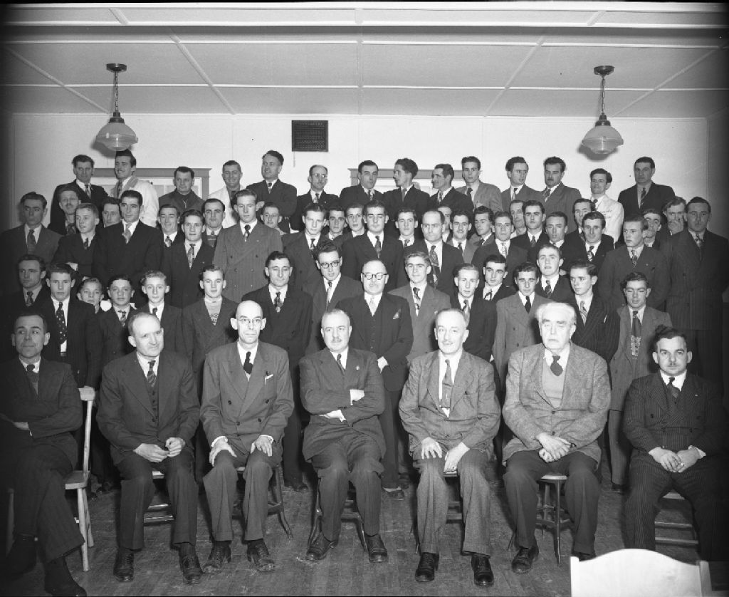 Groupe des élèves avec l'Honorable Camille-Eugène Pouliot, ministre de la Chasse et de la Pêche à l'École des Pêcheries de Grande-Rivière, 1950, Archives nationales à Québec, Fonds Ministère de la Culture et des Communications, (03Q,E6,S7,SS1,D2,P75200), Gustave Bédard.