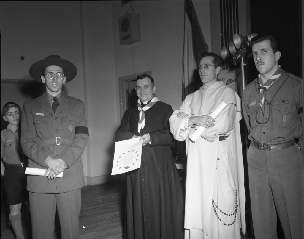 Groupe des officiels. Photo prise à l'occasion de la promesse des scouts envers la forêt. Le Commissaire Maurice Verges adresse la parole aux scouts réunis. De gauche à droite : Maurice Verges, Abbé Alexandre Renaud, aumônier de Notre-Dame-du-Chemin, le Père Leblanc, aumônier de Saint-Dominique et Gaston Morin, ASM de la troupe Notre-Dame-de-Foy, à qui revenait la charge d'organiser la réunion. Salle des Chevaliers de Colomb, 1950, Archives nationales à Québec, Fonds Ministère de la Culture et des Communications, (03Q,E6,S7,SS1,D2,P75305), Neuville Bazin.