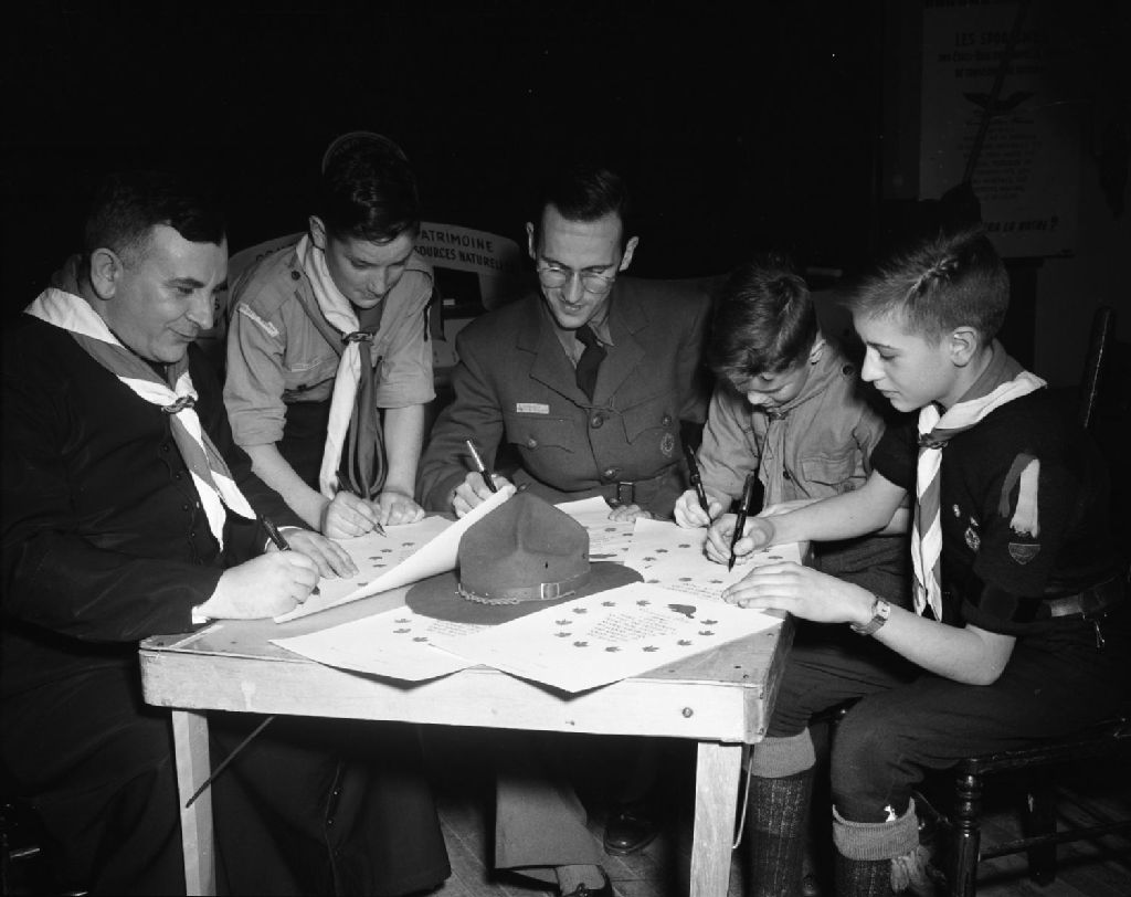 Groupe de scouts ainsi qu'un aumônier et le Commissaire des louvetaux. Aumônier Abbé Alexandre Renaud, Commissaire Maurice Verges. Salle des Chevaliers de Colomb, 1950, Archives nationales à Québec, Fonds Ministère de la Culture et des Communications, (03Q,E6,S7,SS1,D2,P75307), Neuville Bazin.