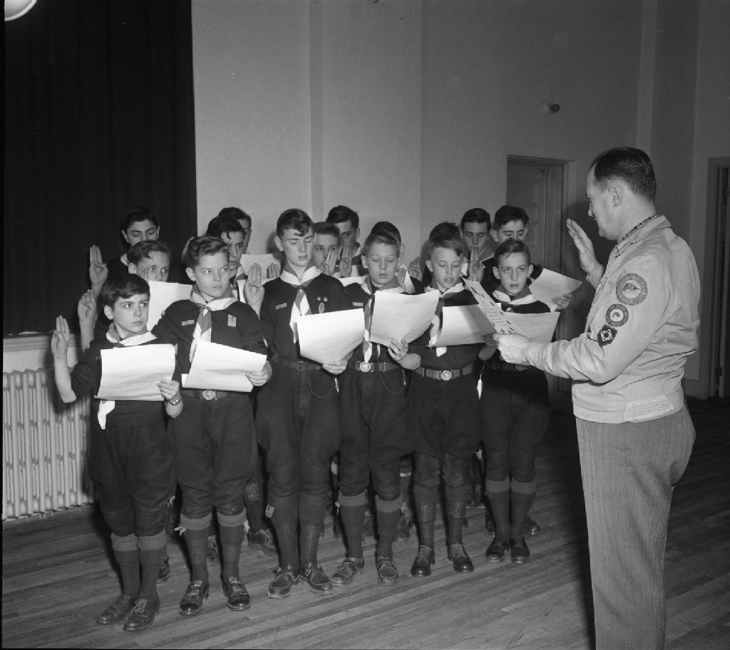 Troupe Notre-Dame-du-Chemin, la pemière de Québec. Les scouts prononcent la promesse de conservation de la forêt. Le scout voit dans la nature l'oeuvre du créateur et il aime les animaux et les plantes. Salle des Chevaliers de Colomb