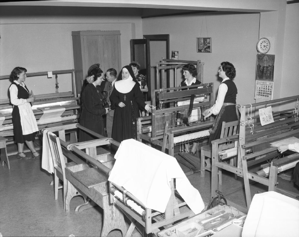 Visite de la salle de tissage par mademoiselle Hélène Doucaki de Grèce. École supérieure du chemin Sainte-Foy, 1950, Archives nationales à Québec, Fonds Ministère de la Culture et des Communications, (03Q,E6,S7,SS1,D2,P75436), Neuville Bazin.