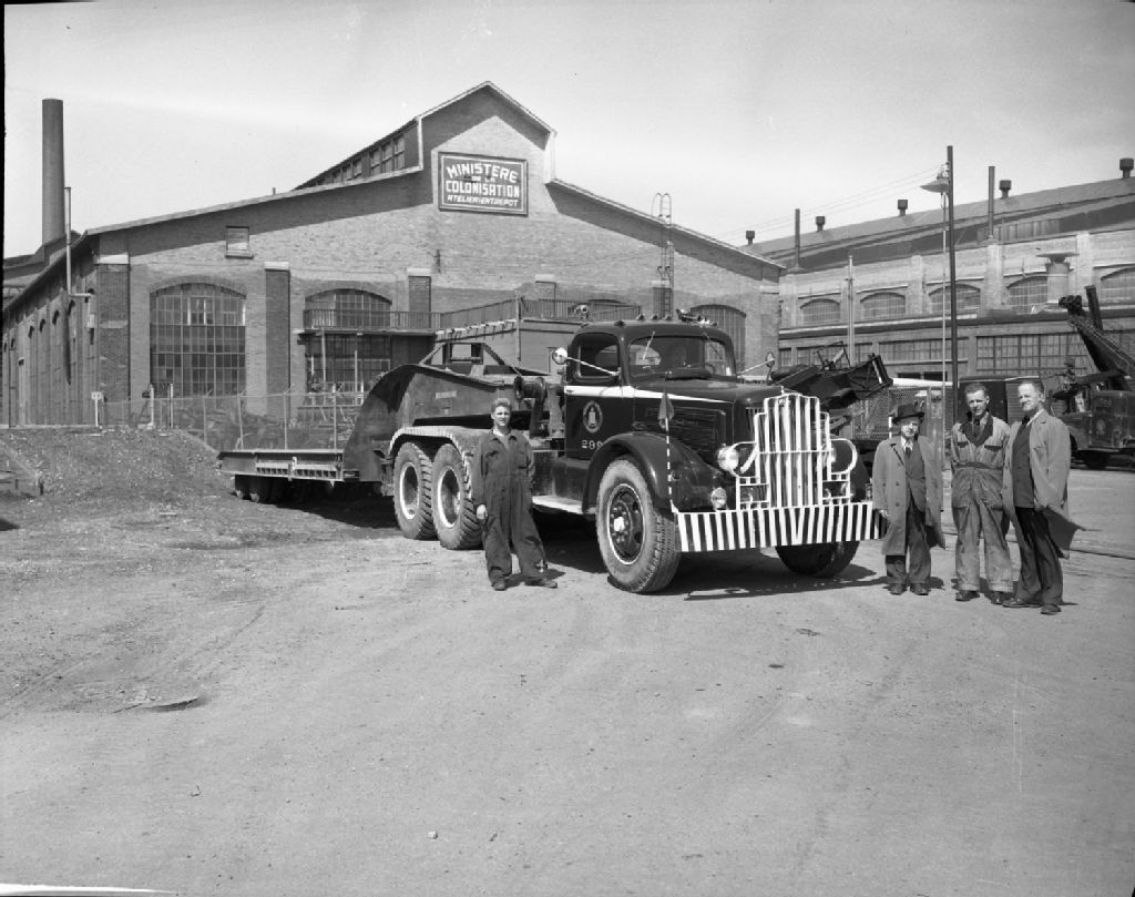 Le fardier de type « Dominion », propriété du Ministère de la Colonisation. Sont également sur la photographie (de gauche à droite) : Gérard Ouellet, publiciste; Freddy Hébert, mécanicien en chef de l'atelier; René Tremblay, chef de la section « entrepôts et outils », Ministère de de la Colonisation. Entrepôt de Saint-Malo, 1950, Archives nationales à Québec, Fonds Ministère de la Culture et des Communications, (03Q,E6,S7,SS1,D2,P75945), Neuville Bazin.